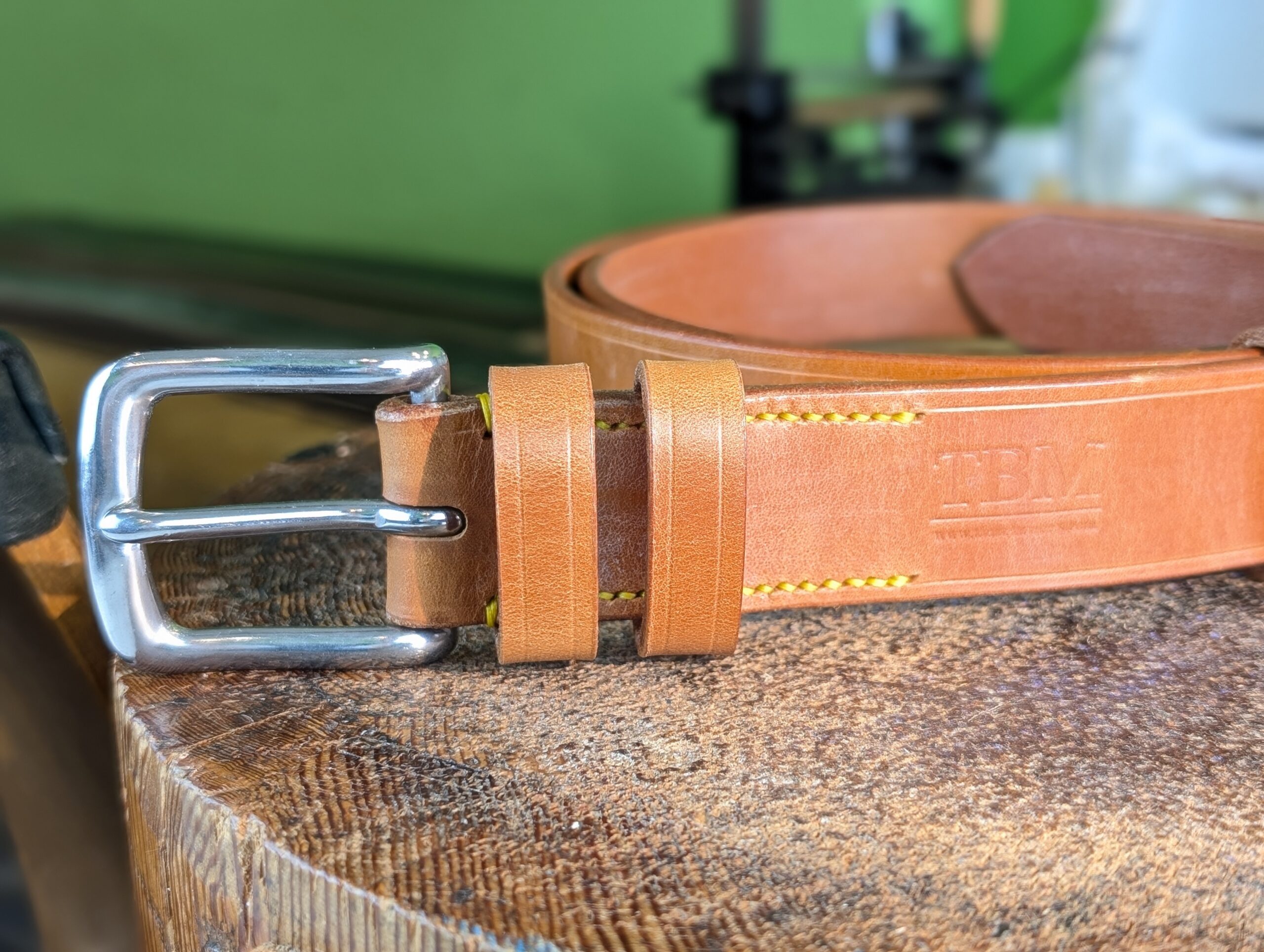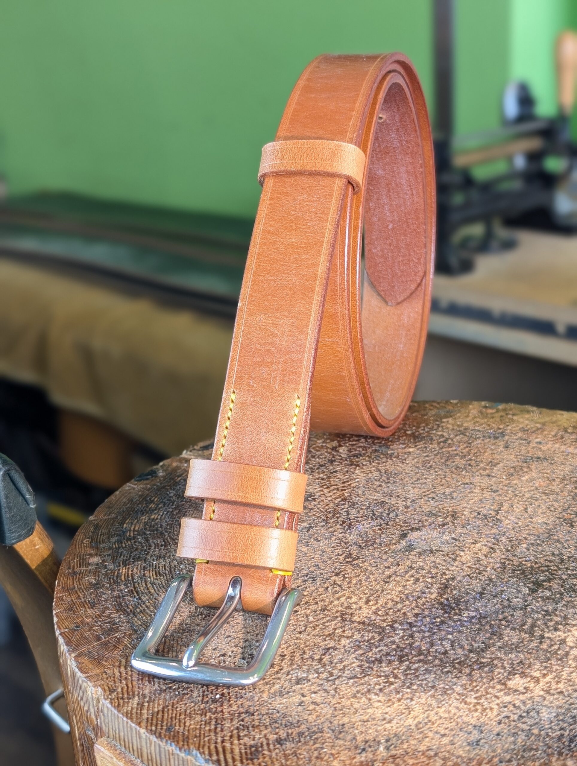 Yellow coloured Tiger thread has been used to hand sew the buckle and fixed keeper into place, and to sew the loose keeper ends together. Stitches are spaced at 8 to the inch