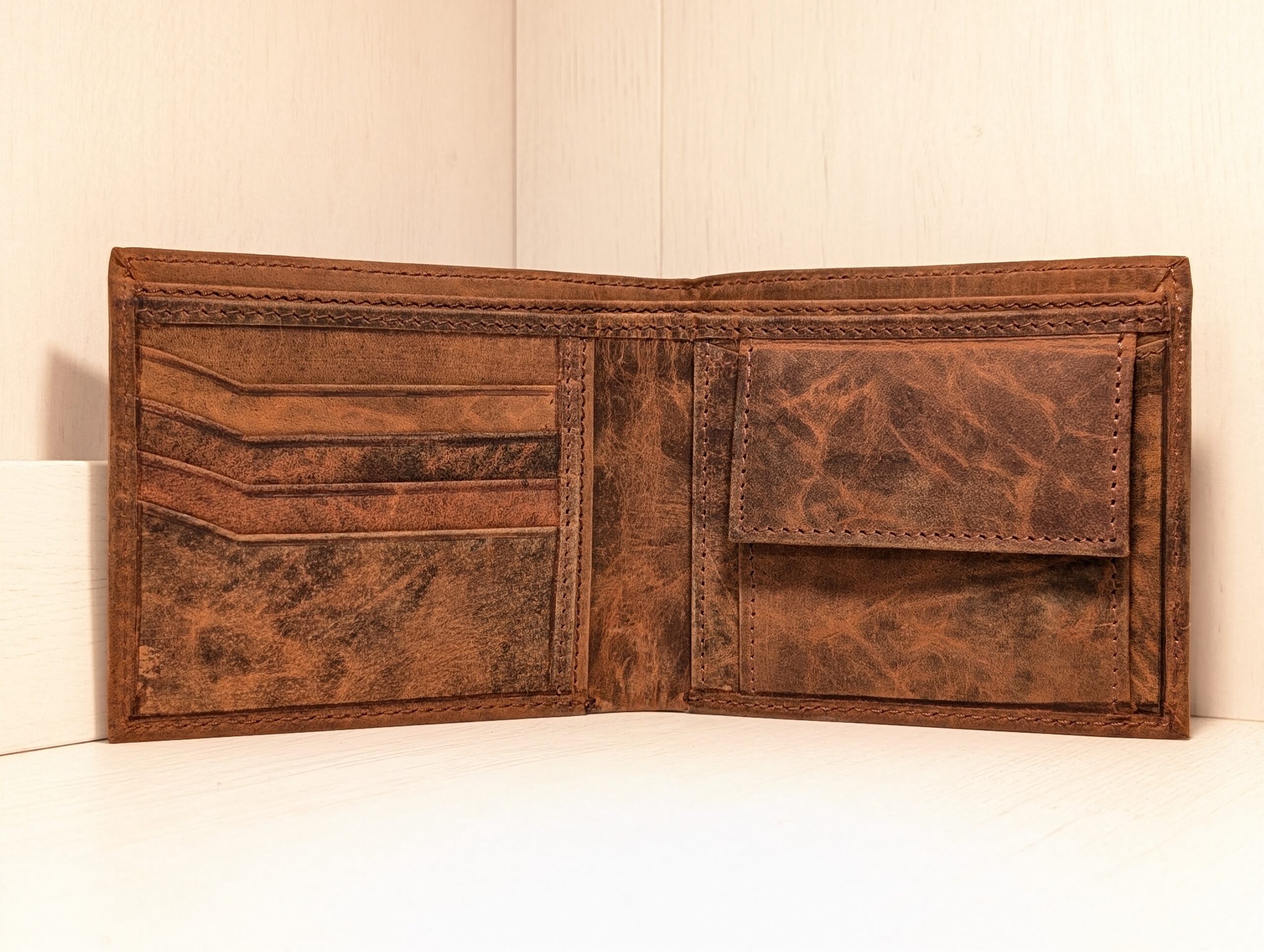 Handcrafted from buffalo leather, for conveniently carrying notes, cards and even a few coins